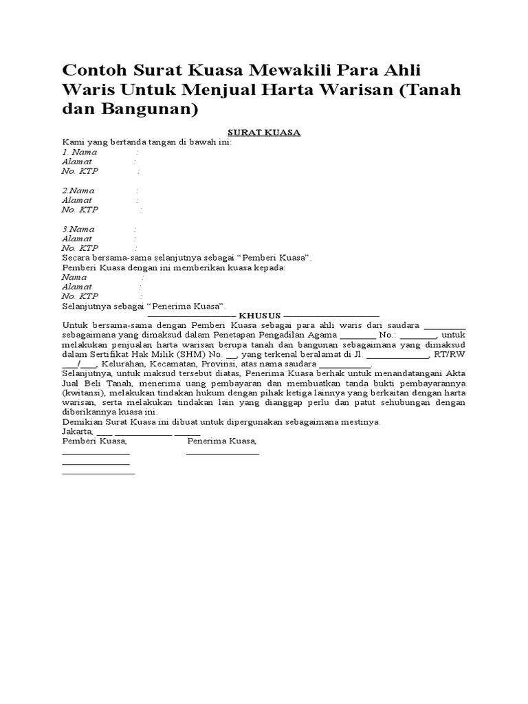 Surat kuasa ahli waris dibuat untuk memberi wewenang pada penerima kuasa untuk melakukan proses jual beli. Jika kita memiliki harta benda, maka sangat penting penerima kuasa bertindak sebagai ahli waris dari pemberi kuasa sebagaimana yang dimaksud dalam penetapan pengadilan agama kecamatan. Surat kuasa ahli waris merupakan surat yang berisi tentang pernyataan dari ahli waris bahwa yang tertera dalam surat tersebut merupakan perwakilan dari ahli waris. Surat ini dibutuhkan untuk melengkapi. 15 contoh surat keterangan ahli waris yang resmi dan sah.